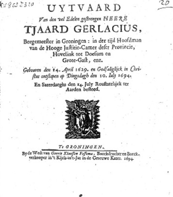 Tjaard GERLACIUS , geboren Groningen 14-04-1629, overleden Groningen 10-07-1694, zoon van Anthonie GERLACIUS en Wibbina FRIX.