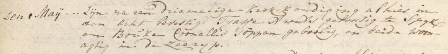 Tjasse is getrouwd Zeerijp 01-05-1785 met Bouwke Cornelis TOPPEN, gedoopt Zeerijp 05-05-1765, overleden en begraven Zeerijp 19-07-1805, dochter van Cornelis Pieters TOPPEN en Geeske Hiddes.