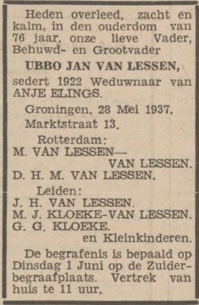 Ubbo Jan van LESSEN, geboren Groningen 02-10-1860, overleden Marktstraat 13 Groningen 28-05-1937, zoon van Dirk Herman Michael van LESSEN en Jacoba Hermina BEVERSEN.