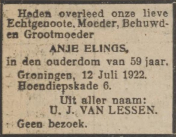 Ubbo is getrouwd Uithuizen 05-06-1895 met Anje ELINGS, geboren Uithuizen 03-01-1863, overleden Hoendiepskade 6 Groningen 12-07-1922, dochter van Steven BROEILS ELINGS en Martje WIERSUM.