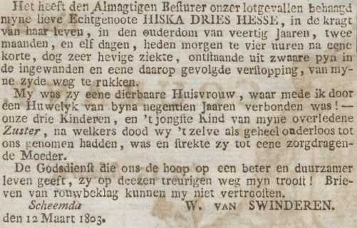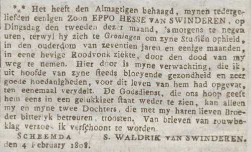 - Eppo Hesse van SWINDEREN, geboren Scheemda 26-09-1790, overleden in het Langhuis, Martinikerkhof Groningen 02-02-1808.