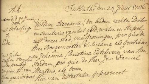Willem HORA SICCAMA, geboren Heerestraat Groningen, gedoopt Groningen 07-09-1763, overleden Groningen 01-06-1844, zoon van Johan HORA SICCAMA en Egbertha Louisa BECKERINGH.