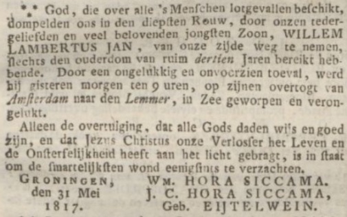 - Willem Albertus Jan HORA SICCAMA, gedoopt Groningen 11-03-1804, overleden op zee 30-05-1817 (zie advertentie).